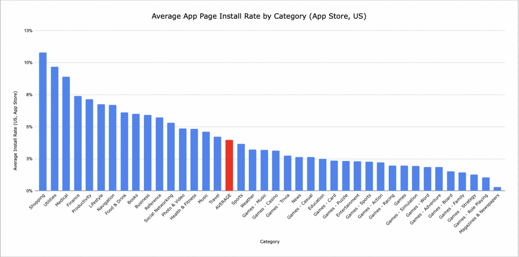 La tasa de instalación promedio en todas las categorías de aplicaciones en la App Store fue del 4%. A partir de los resultados de búsqueda o exploración, las aplicaciones de la categoría Compras convirtieron a los visitantes de la tienda con la tasa más alta de 10,8%, mientras que las aplicaciones de la categoría Revistas y periódicos tuvieron la tasa de instalación más baja de 0,3%.